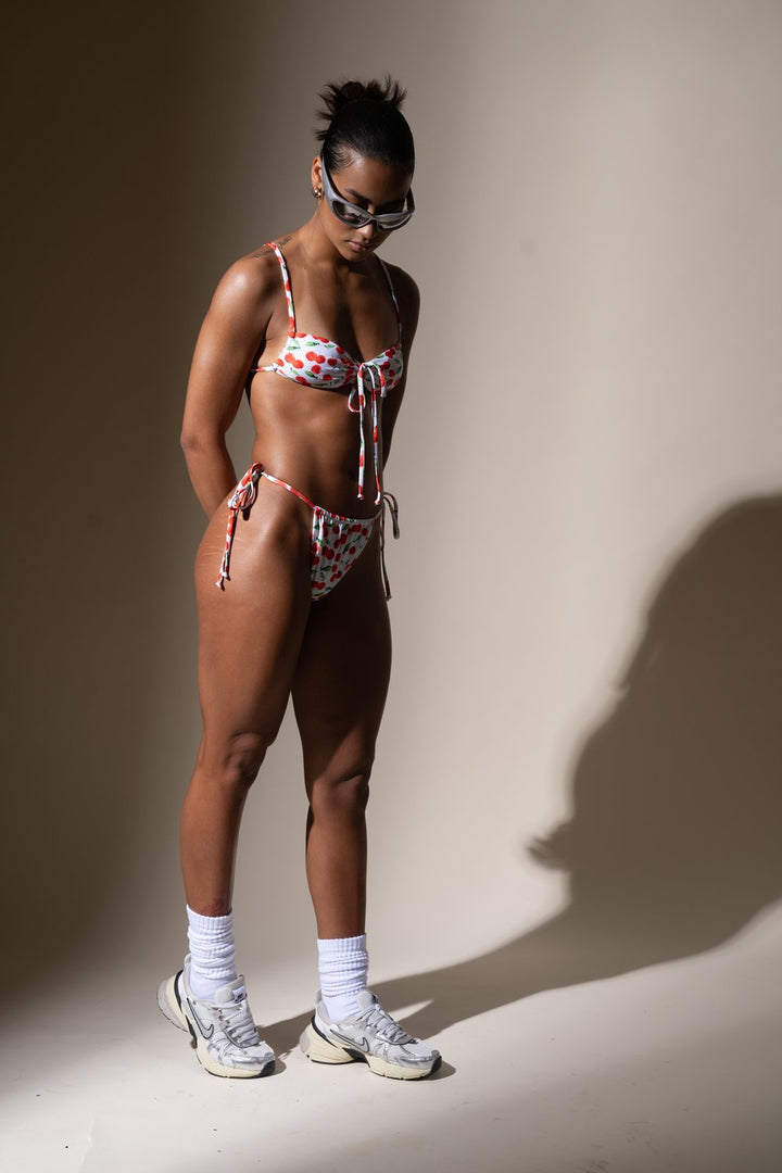 Step into timeless elegance with our vintage-inspired cherry pattern bathing suit. This charming ensemble captures the essence of retro glamour with its delightful cherry motif scattered across a white background. Embrace nostalgia while exuding playful sophistication, and customize your look with various tying options, whether it's a halter neck, criss-cross back, or classic tie-side bottoms.